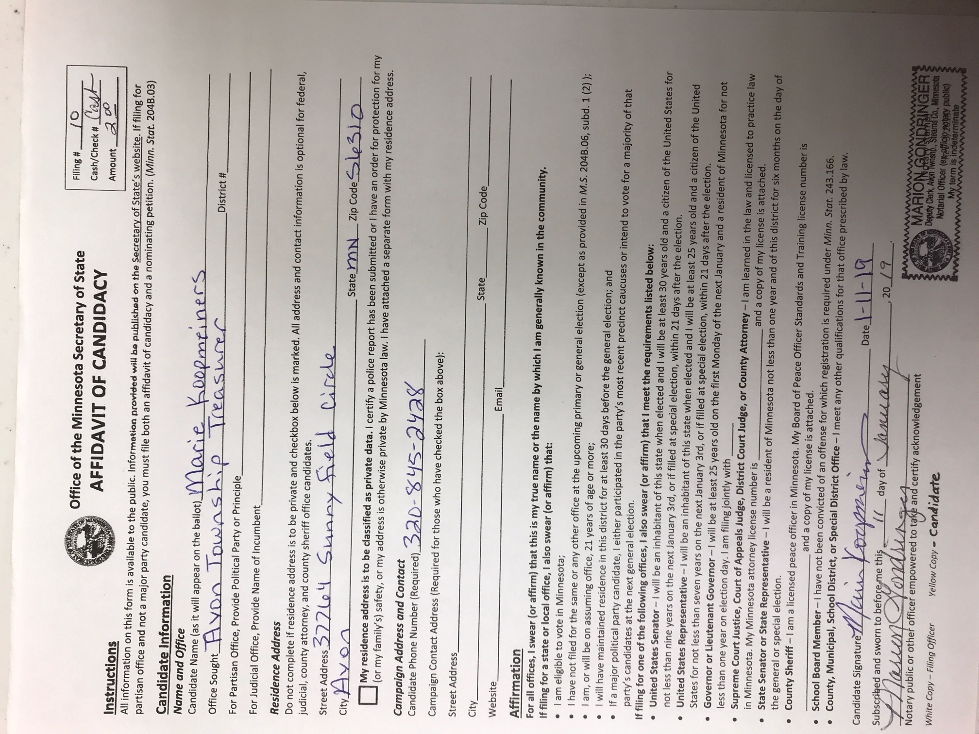 The annual Township Election was held on March 12, 2019 in the Town Hall (16881 Queens Road, Avon, MN). In this election (legal notice), residents voted for one Supervisor for a three-year term and one Treasurer for a two-year term. Affidavits of Candidacy were filed by Will Huston, Marie Koopmeiners and Kelly Martini. The pre-test and Public Accuracy tests (legal notice) were performed prior to the election.