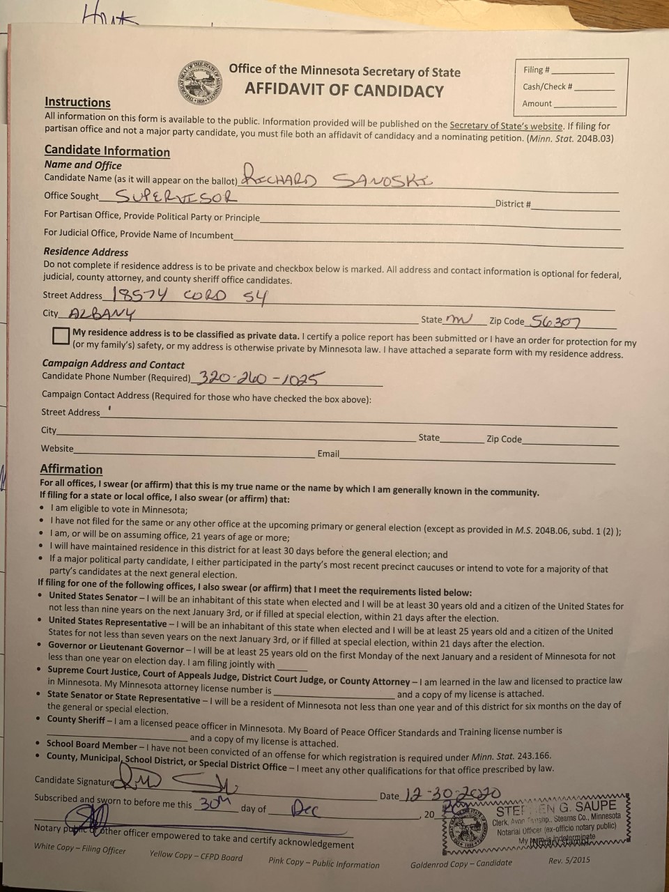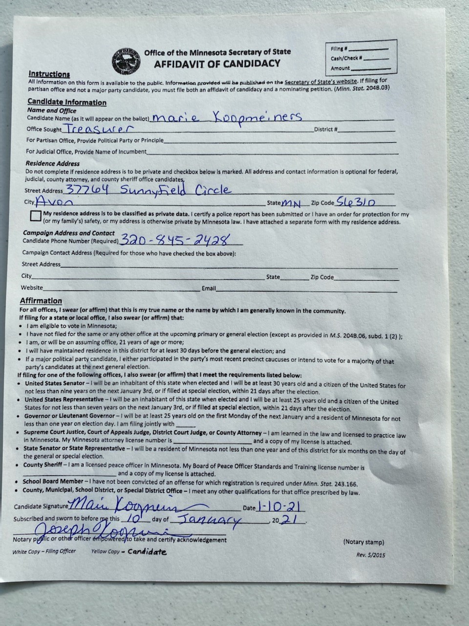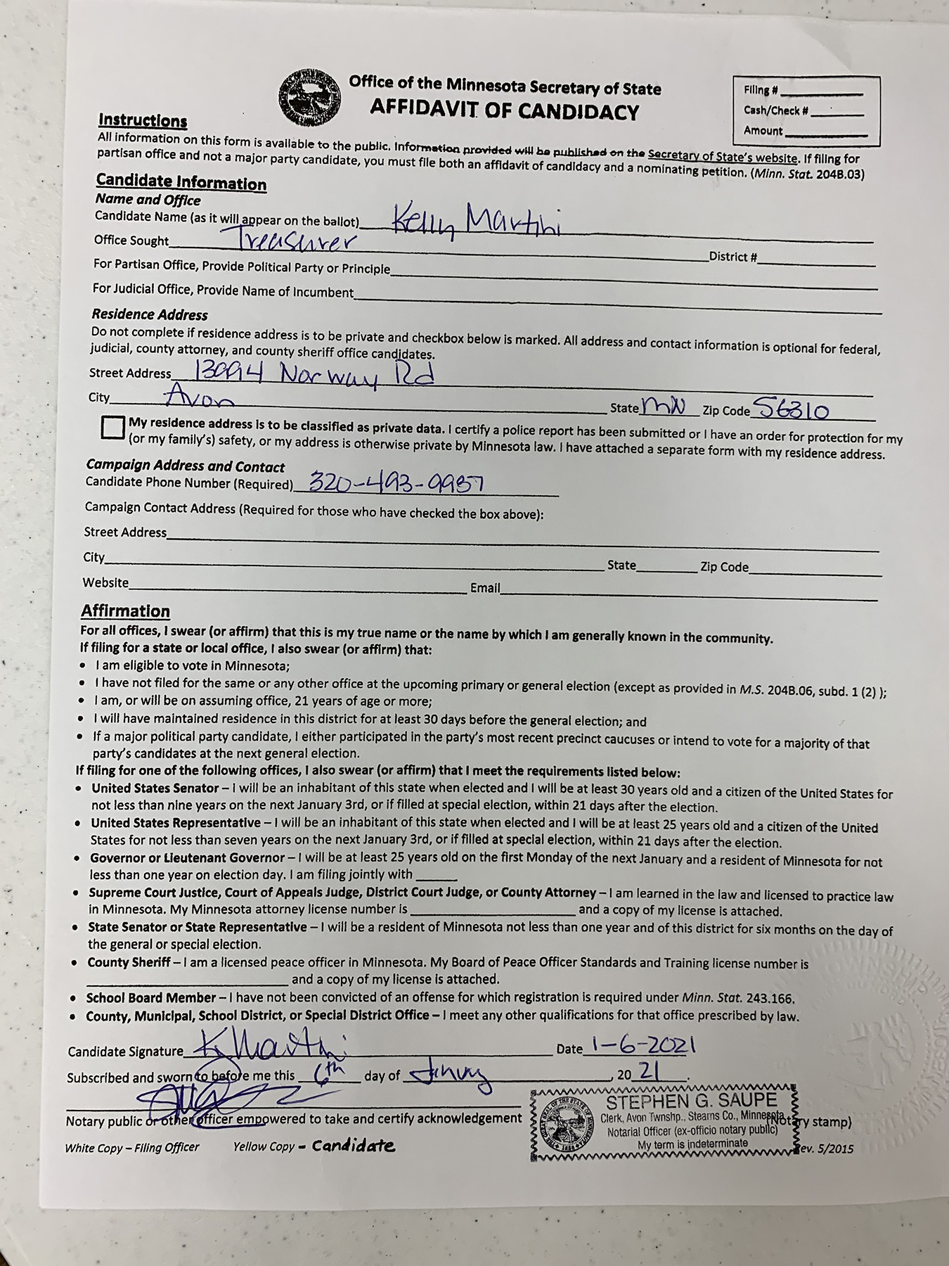 The annual Township Election was held on March 9, 2021 in the Town Hall (Resolution 12-02-20) located at 16881 Queens Road, Avon (MN). In this election (legal notice), residents voted for one Supervisor for a three-year term, and one Treasurer for a two-year term. Affidavits of Candidacy were filed by Kelly Martini, Marie Koopmeiners, and Rich Sanoski . The pre-test and Public Accuracy tests (legal notice) were performed prior to the election.